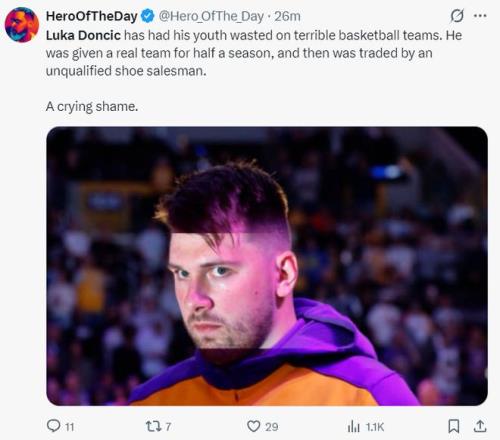 美媒HOTD(詹黑媒体):东契奇把青春时光浪费在了一些水平极低的球队上(湖人)。他曾短暂效力于一直实力不错的球队(独行侠),但被一位毫无能力的卖球鞋的总经理交易掉了,太令人遗憾了。