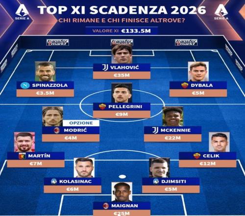 北京时间1月3日,德转列出了意甲联赛中现有合同今夏到期的最佳11人阵容,弗拉霍维奇、迪巴拉、莫德里奇以及迈尼昂在列。