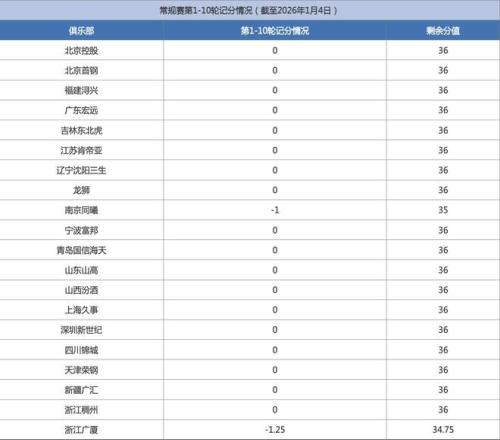 北京时间1月6日,CBA官方公布了截至1月4日,2025-2026赛季CBA联赛常规赛青少年友好型赛场记分公示,浙江广厦与南京同曦分别被记1.25分和1分。