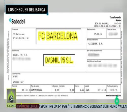 七家银行已向巴塞罗那第一号指示法官提交相关文件,文件明确显示,巴萨每月会向内格雷拉旗下的Nilsad SA公司开出24张支票,而各相关账户之间,仅本票与支票的往来金额就高达19万欧元。