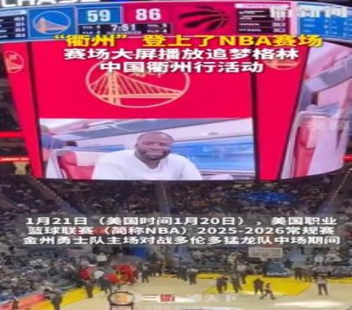 1月21日(美国时间1月20日),美国职业篮球联赛(简称NBA)2025-2026常规赛,金州勇士队主场对战多伦多猛龙队中场期间,赛场大屏播放NBA四冠王追梦格林中国衢州行活动,向广大中国球迷致以新年问候。